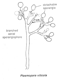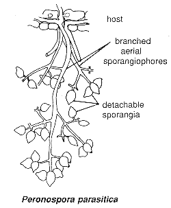 The downy mildews include blue mould of tobacco and downy mildew of grape (Potato blight is technically also a downy mildew). Since these diseases also have historic or economic importance, I'll tell you something about them. In this group the mitosporangia are borne on highly differentiated, branched, aerial sporangiophores, as shown below.