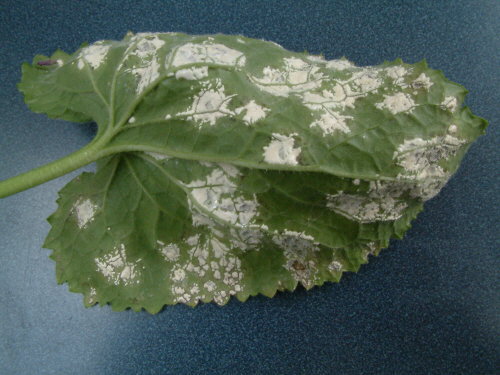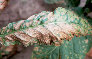 The weather that year favoured the development and spread of the fungus, and a large-scale epidemic ensued. About 30% of the Ontario crop, worth $100 million, was lost. The picture above shows what the pathogen does to tobacco leaves.