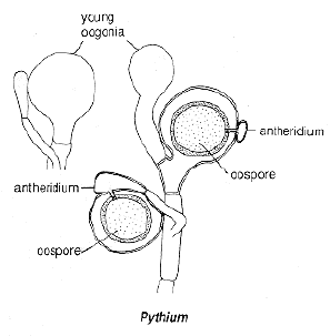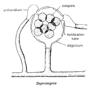 Sperms are often released before the adjacent oogonium is ripe. This may be a mechanism for avoiding self-fertilization, and ensuring outbreeding (called heterothallism in fungi). After the egg has been fertilized, the resulting zygote becomes amoeboid, moves out onto the top of the oogonium, and encysts, developing a thick wall (right-hand diagram). Meiosis probably occurs when this resting spore germinates, producing a germ tube (another name for a first hypha).
