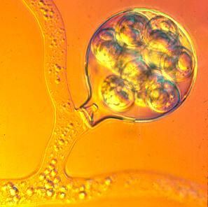 (3) The walls of the hyphae usually contain a cellulose-like material (a poorly crystallized hexose polymer), though this makes up only a fraction of the cell wall, and chitin has also been found in some oomycetes. All of these characters separate them from the eumycotan fungi. But the feature that gives the group its name is its oogamous sexual reproduction, and the fact that each zygote develops into a thick-walled, persistent oospore (Note, however, that fungal oogamy is not unique to oomycetes - some chytridiomycetes such as Monoblepharis do it, too.)