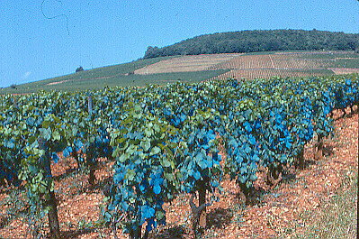 This picture shows the bluish cast of grape leaves which have been sprayed with Bordeaux
