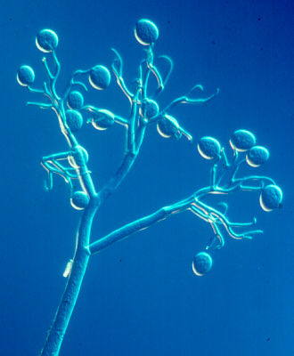 The phase-contrast photomicrograph below shows a single, characteristically branched sporangiophore of Plasmopara with one sporangium still attached.
