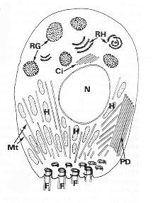 This drawing (after Barr 2001) shows the features of the zoospore of the Neocallimastigales. Note the roots of the multiple cilia (flagella) at the bottom of the drawing.